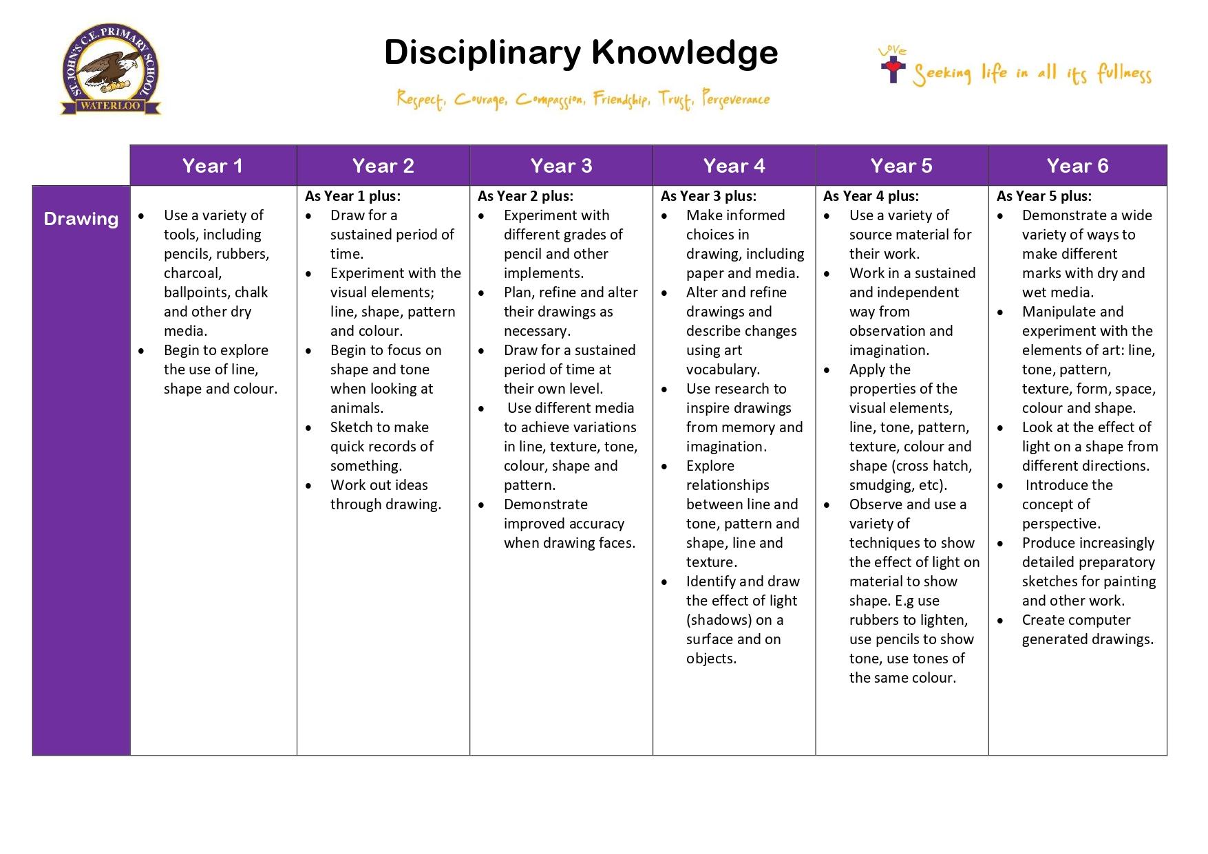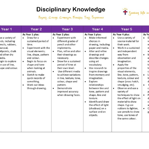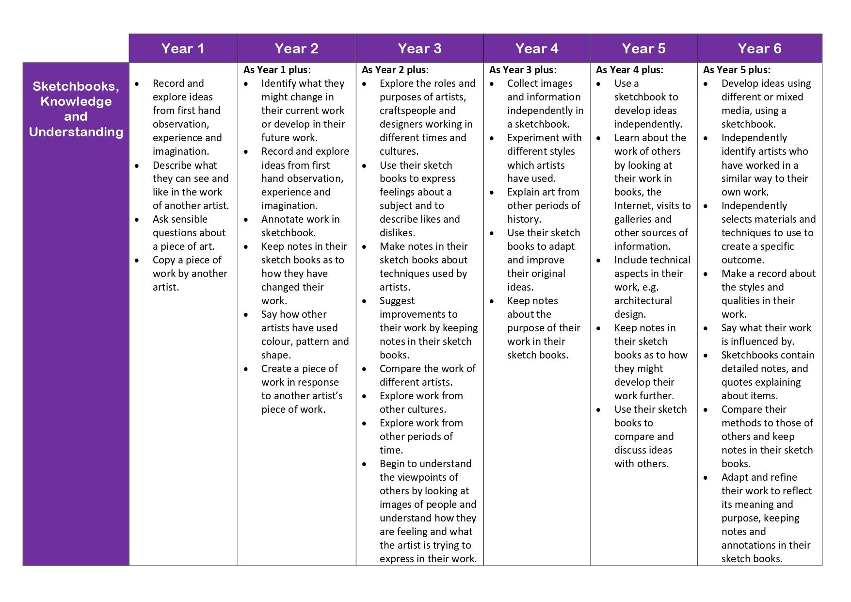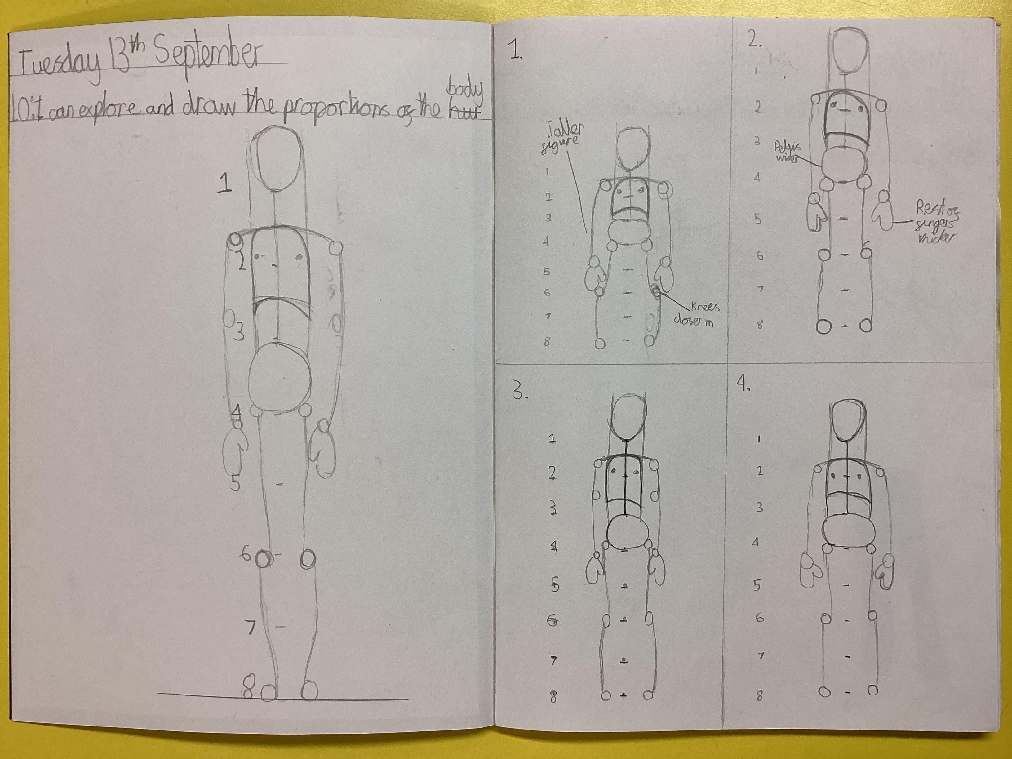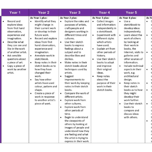 Sketch books are an important tool for our children to record their observations and use them to review and revisit ideas, especially in Key Stage 2. Teaching and learning of Art and Design will take account of the children's previous learning and their experiences. Evidence of this will be in their sketch book, which will go through the school with the child to enable them to reflect on their creative journey and the disciplinary knowledge explored.