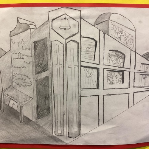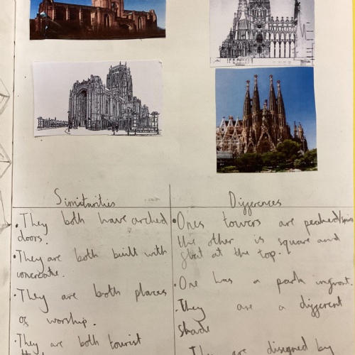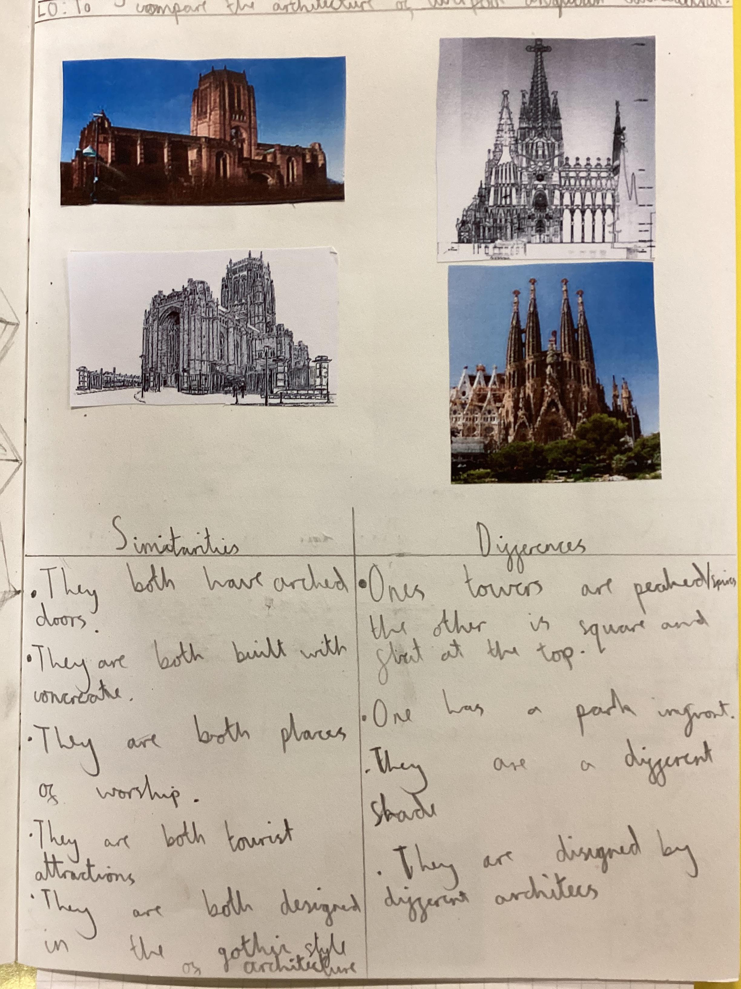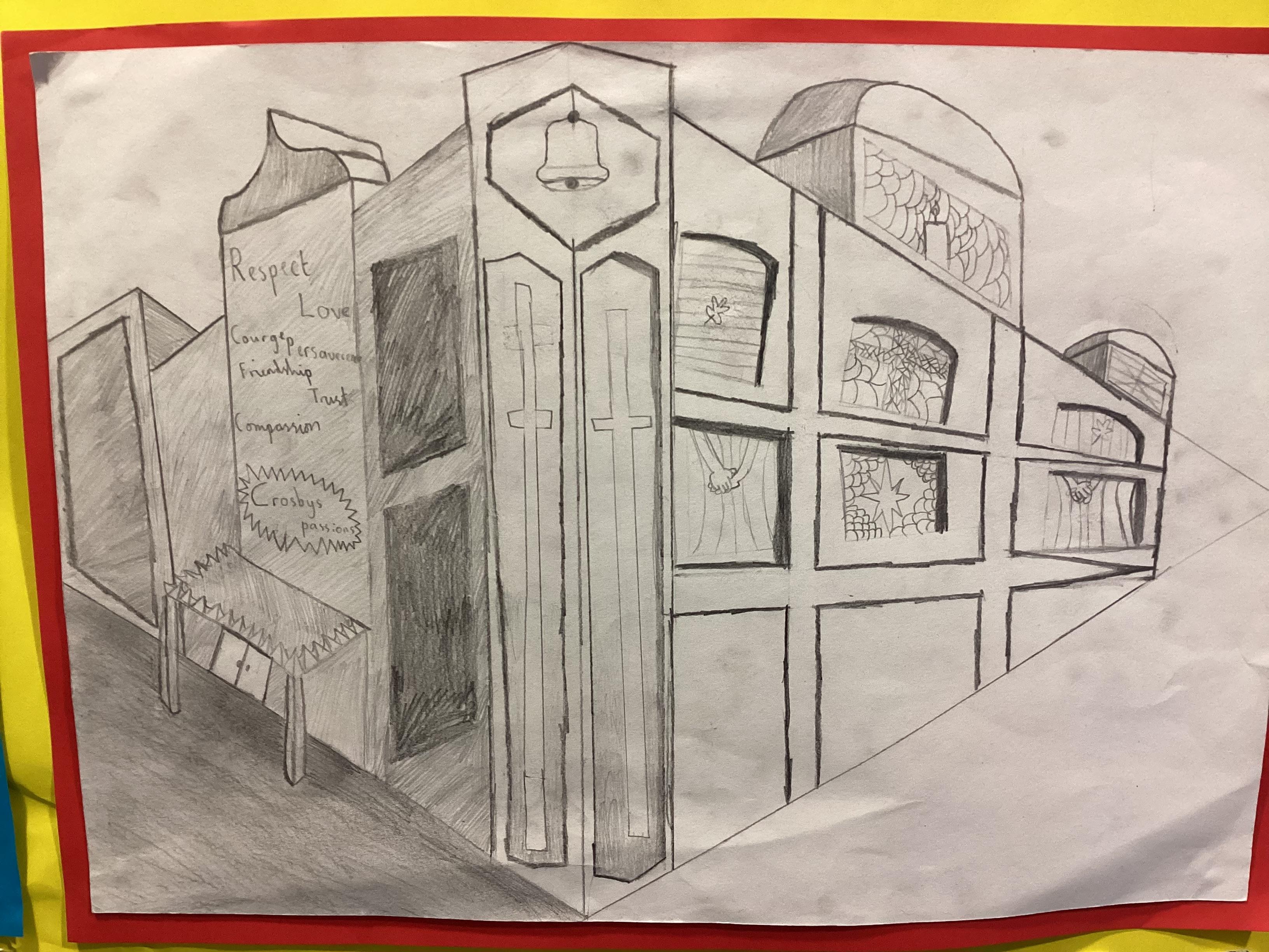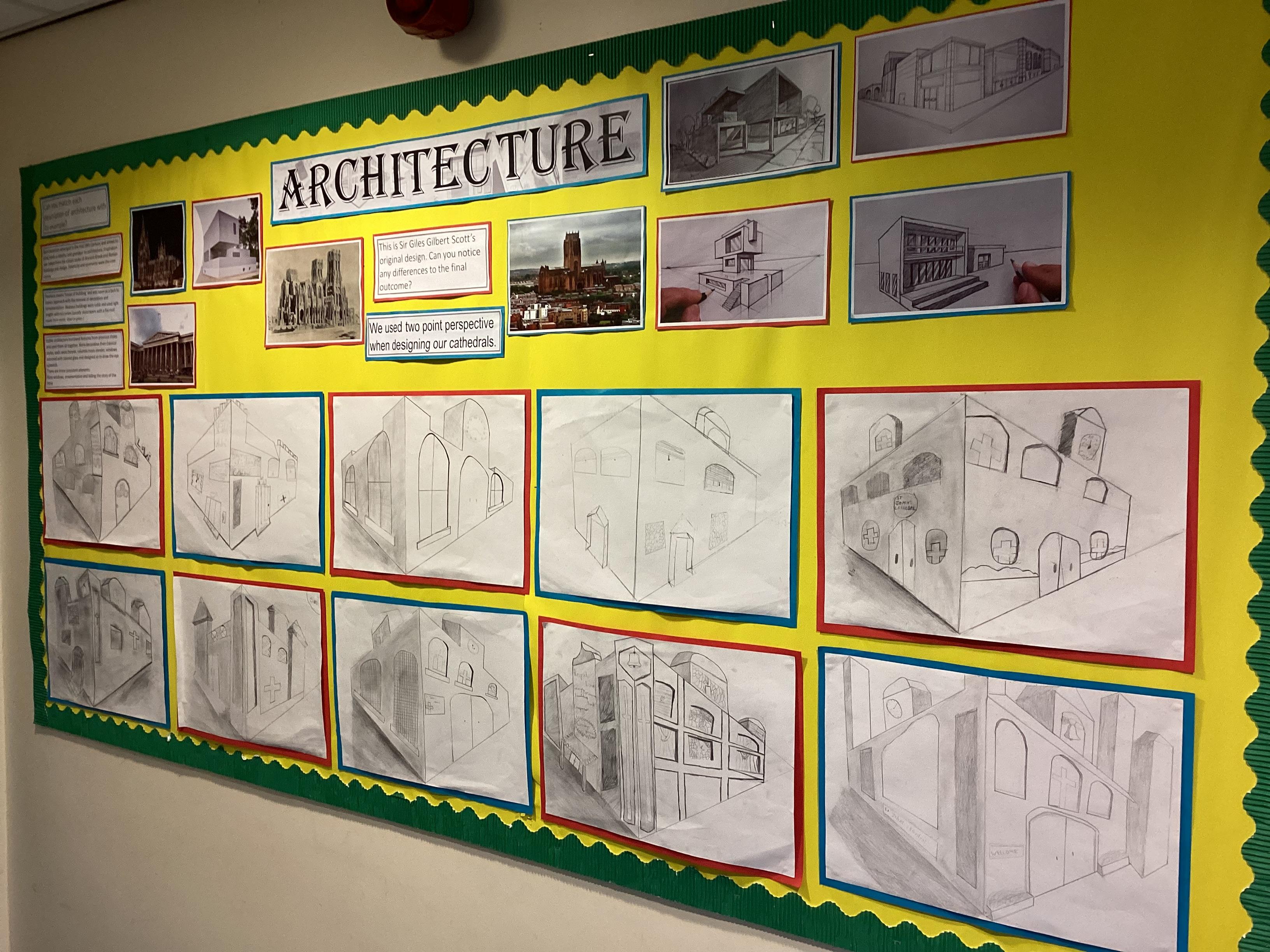We researched great architects, including Sir Giles Gilbert Scott, who designed the Liverpool Anglican Cathedral. We were inspired by different styles of architecture which enabled us to create detailed and accurate architectural drawings of our own cathedral design.