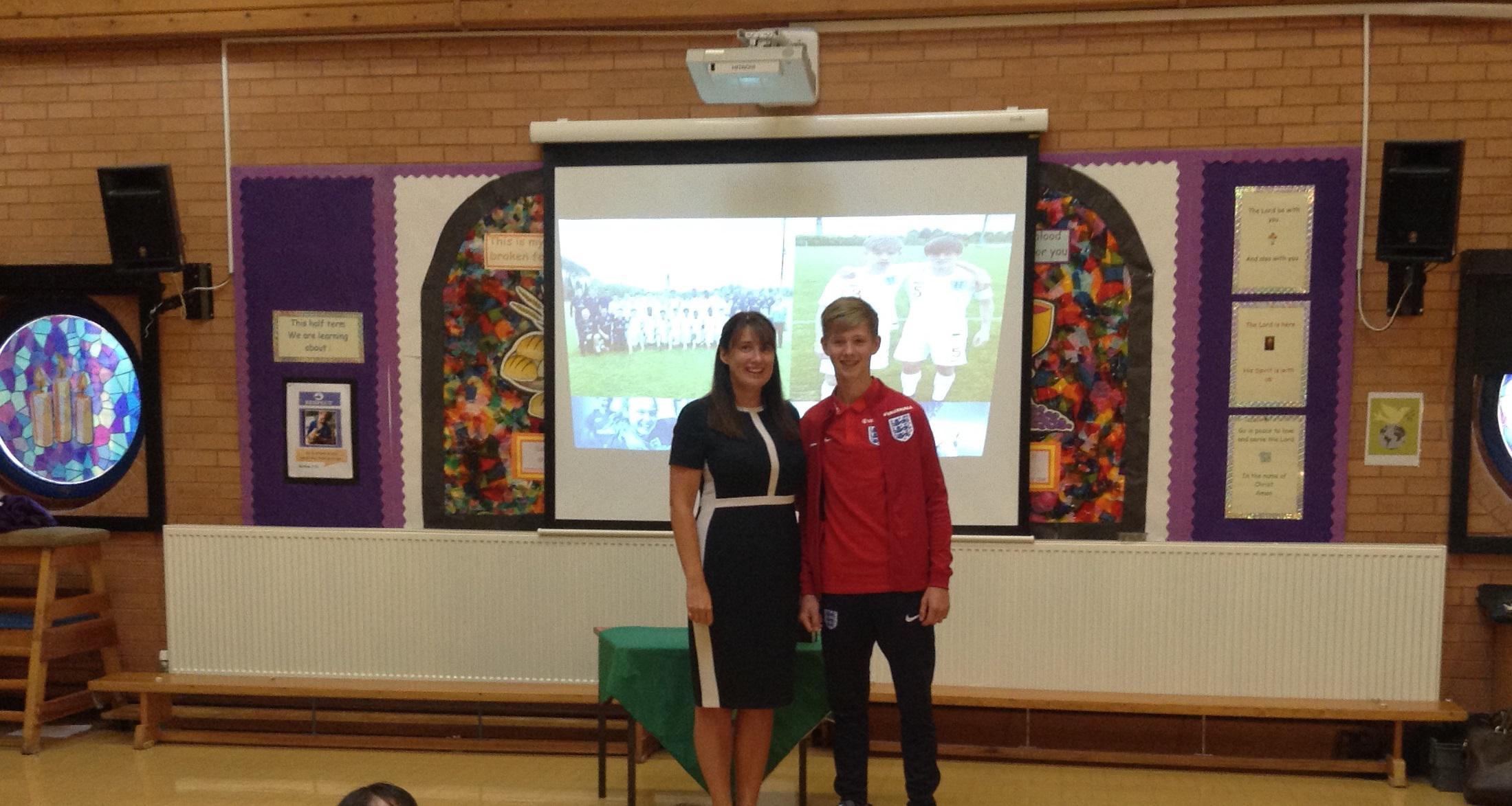 As part of our World Cup theme week, we were delighted to welcome Caitlin Hawkins to our school. Caitlin is the Player Education Manager for England’s youth football team. She also brought a very special visitor: Jake Garret. Jake is a former pupil of St. John’s CE School who plays for the U15s national team. The children were delighted to meet Caitlin and Jake and ask them lots of questions. Caitlin has kindly donated an England football shirt to the School.