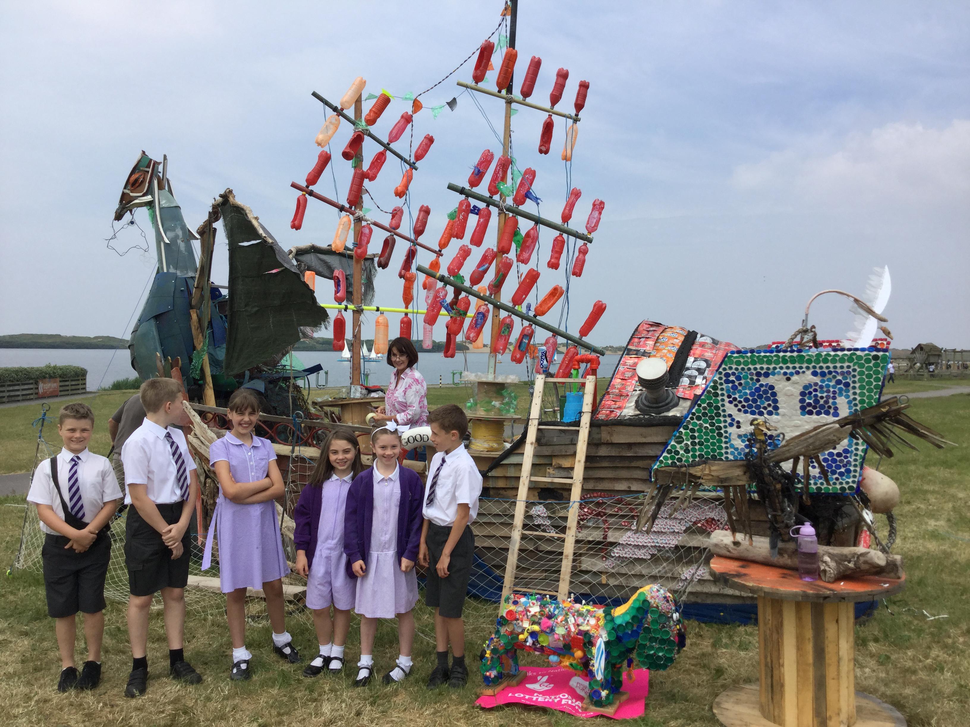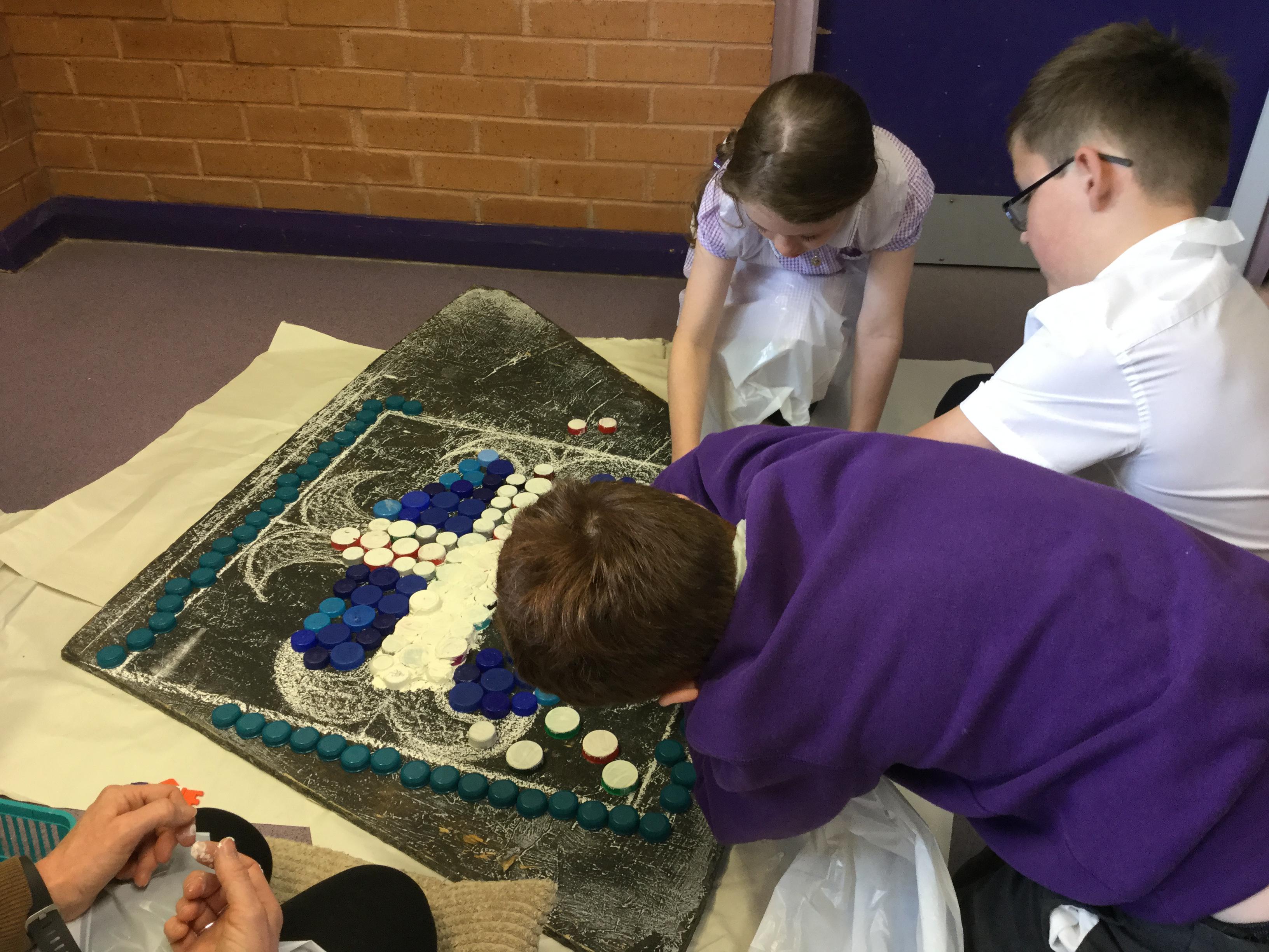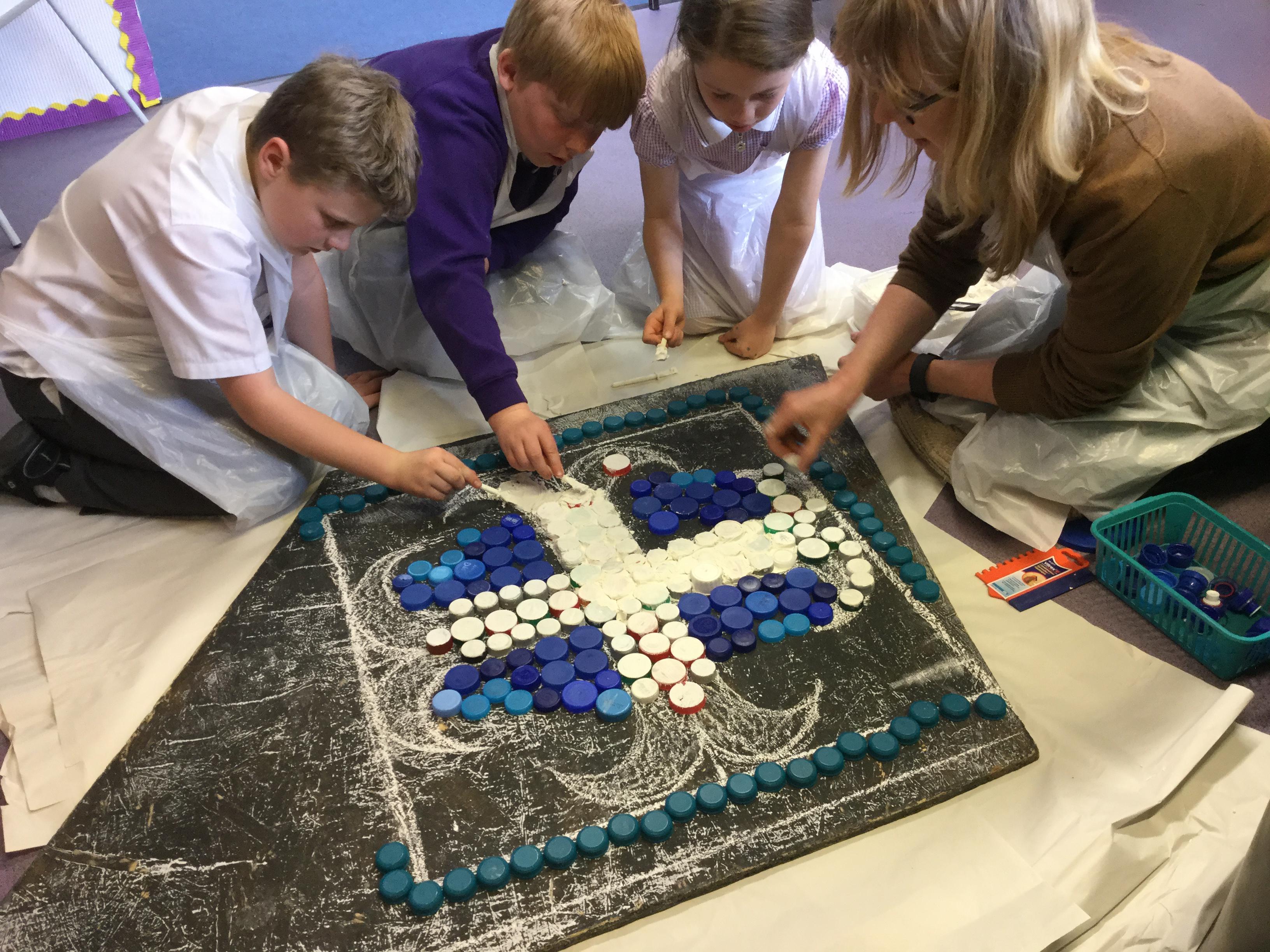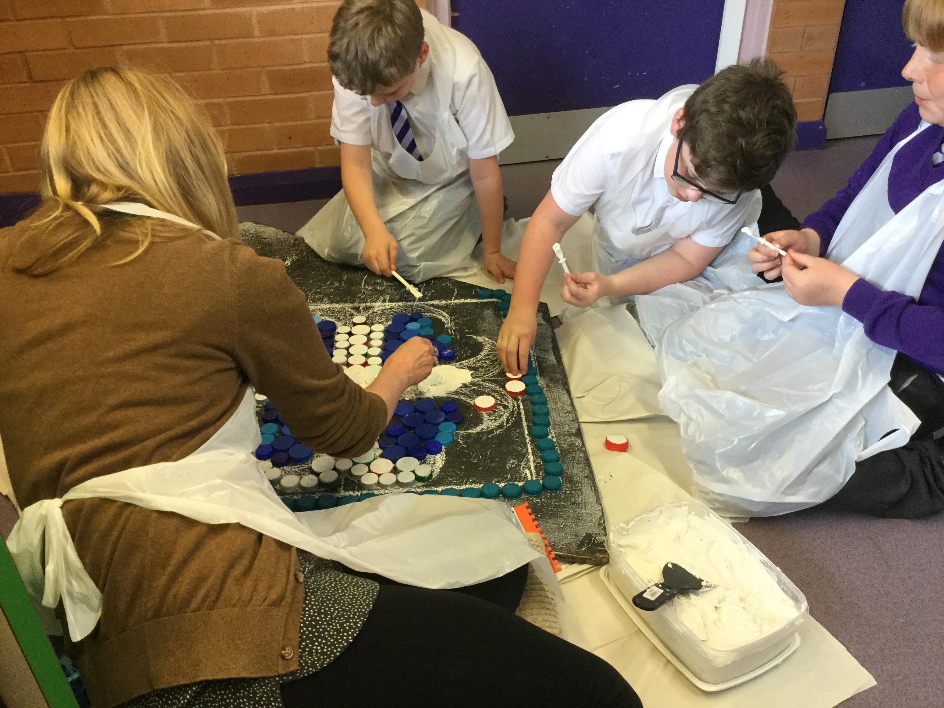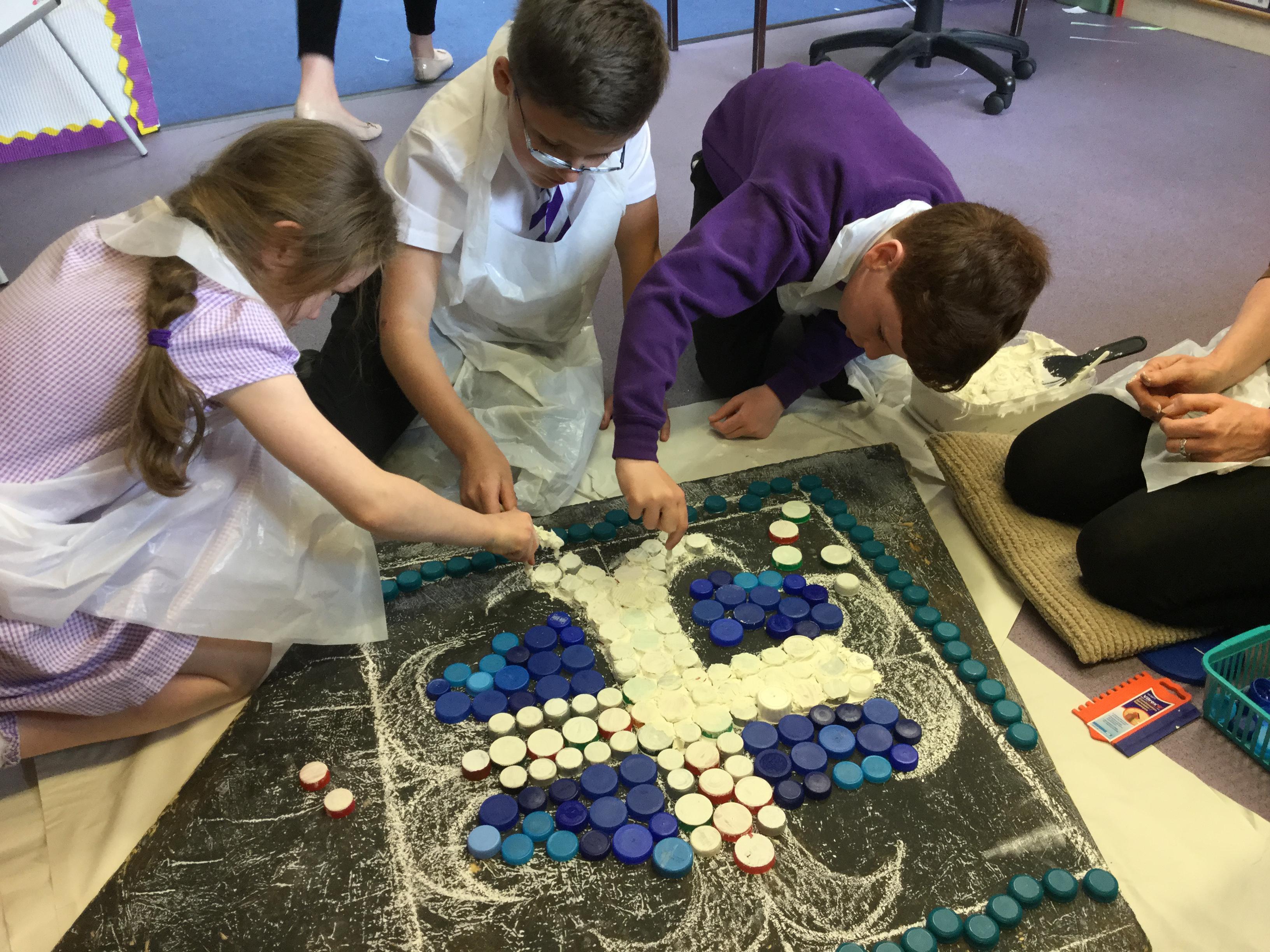 This summer, Class 5 were asked to create a piece of art using nothing but recycled materials. The project -The Good Ship Flotsam- is a ship that has been designed by local artist Lynne Winstanley to recognise the global environmental issues caused by marine pollution. St John's pupils worked strenuously, collecting as many bottle tops as they possible could,  to create a mosaic of the Sefton cross. Take a look at our pictures below, or why not visit the ship itself at Crosby Marina, to see the wonderful piece of art created by our talented children.