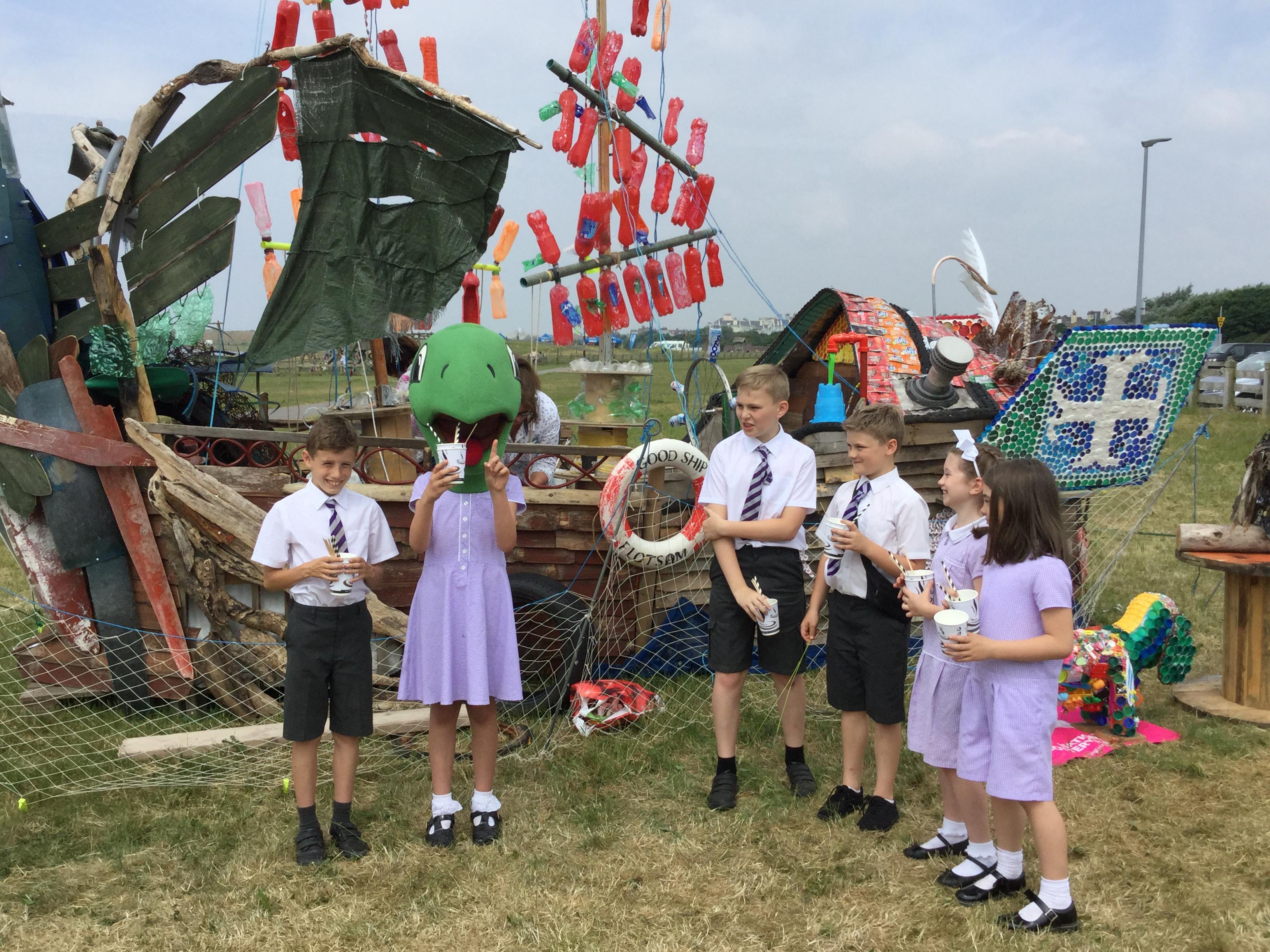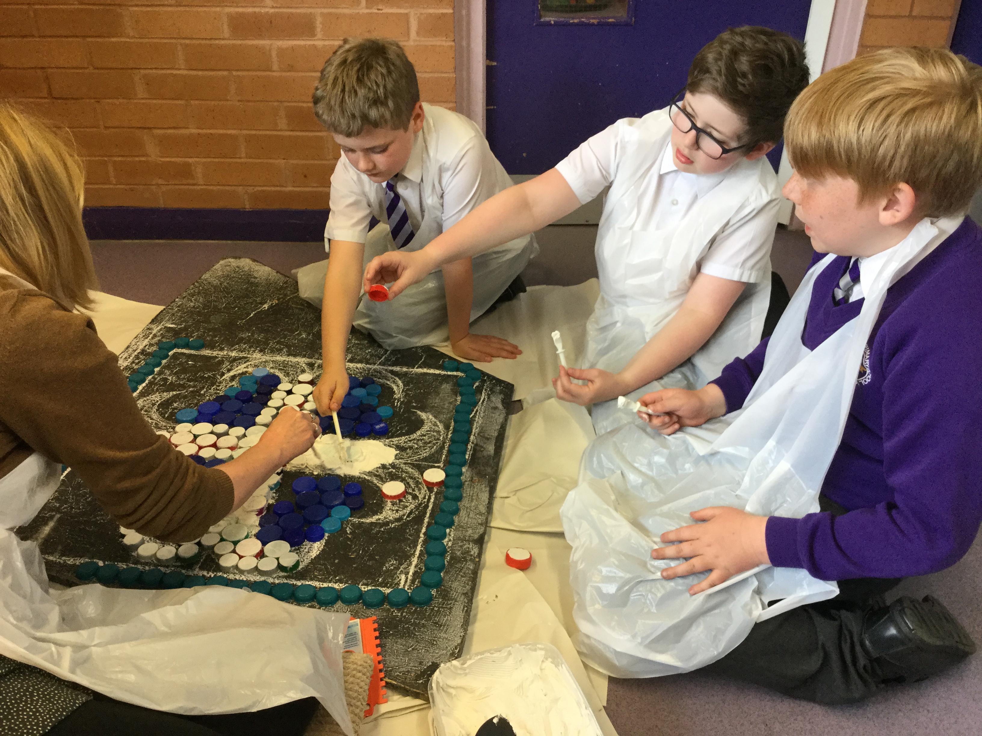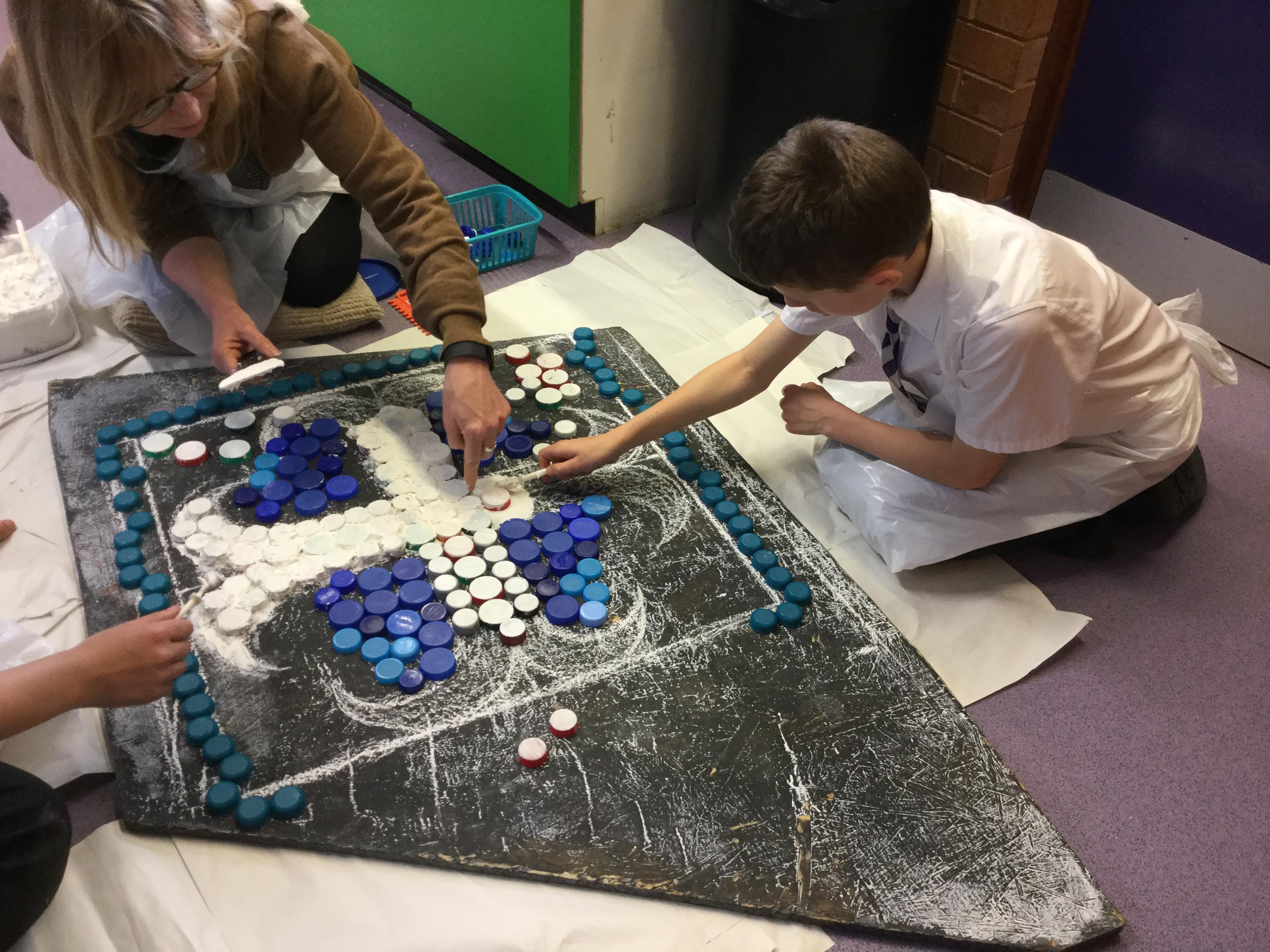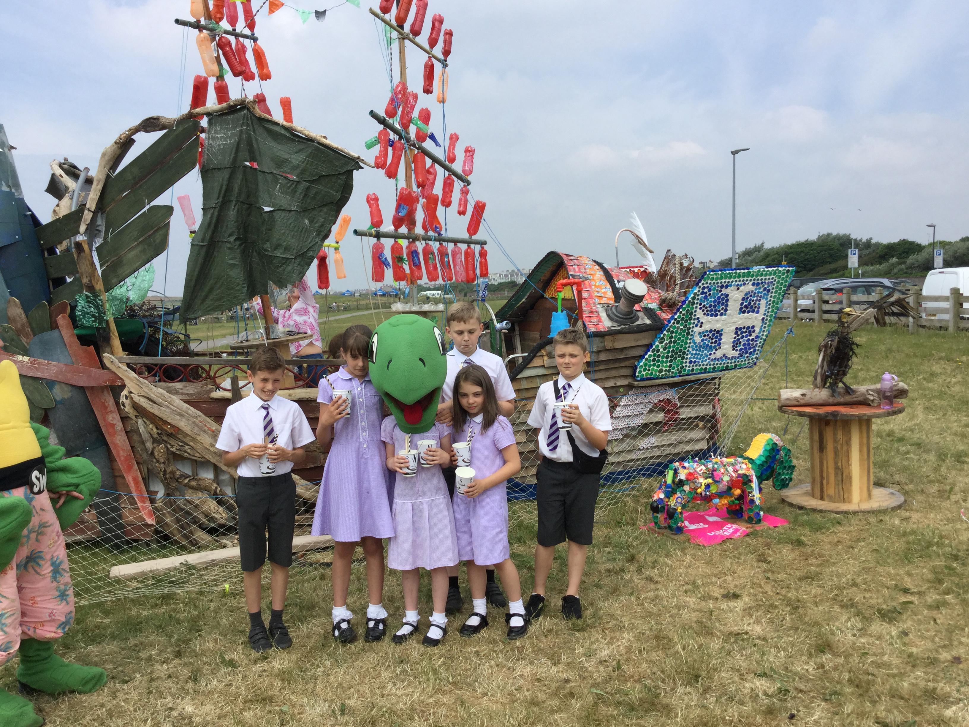 This summer, Class 5 were asked to create a piece of art using nothing but recycled materials. The project -The Good Ship Flotsam- is a ship that has been designed by local artist Lynne Winstanley to recognise the global environmental issues caused by marine pollution. St John's pupils worked strenuously, collecting as many bottle tops as they possible could,  to create a mosaic of the Sefton cross. Take a look at our pictures below, or why not visit the ship itself at Crosby Marina, to see the wonderful piece of art created by our talented children.