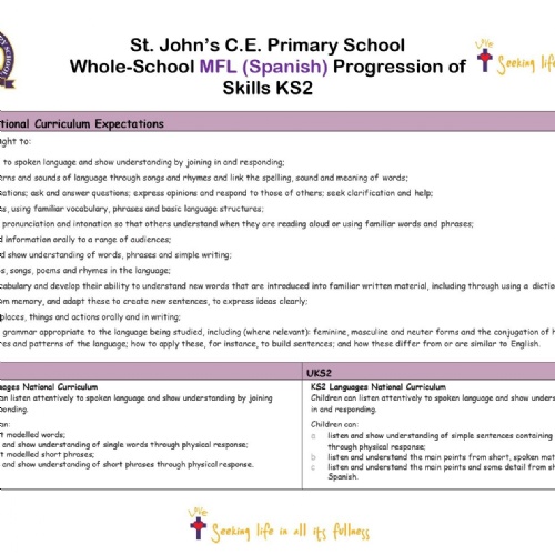 At St John's CE Primary School, the learning of an additional language provides our children with a valuable educational, social and cultural experience. It helps them to develop communication skills, including the key skills of speaking and listening. It also supports and extends our children's knowledge of how language works. We aim to develop children's language skills to express their ideas and thoughts in another language and understand and respond to its speakers, both in speech and writing.