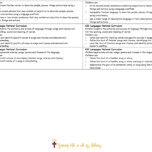 Spanish is taught to all key stage 2 children through discrete, weekly Spanish lessons, which begin in Year 3. Spanish is taught using the Primary Languages Network programme of study, which meets the national curriculum requirements. It ensures progression throughout key stage 2 across the four skills of listening, speaking, reading and writing.