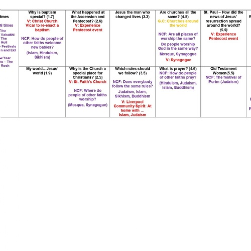 Each unit of RE will focus on one or more of the eight key concepts: God (Father, Son and Holy Spirit), Creation, Fall, People of God, Incarnation, Gospel, Salvation and Kingdom of God.