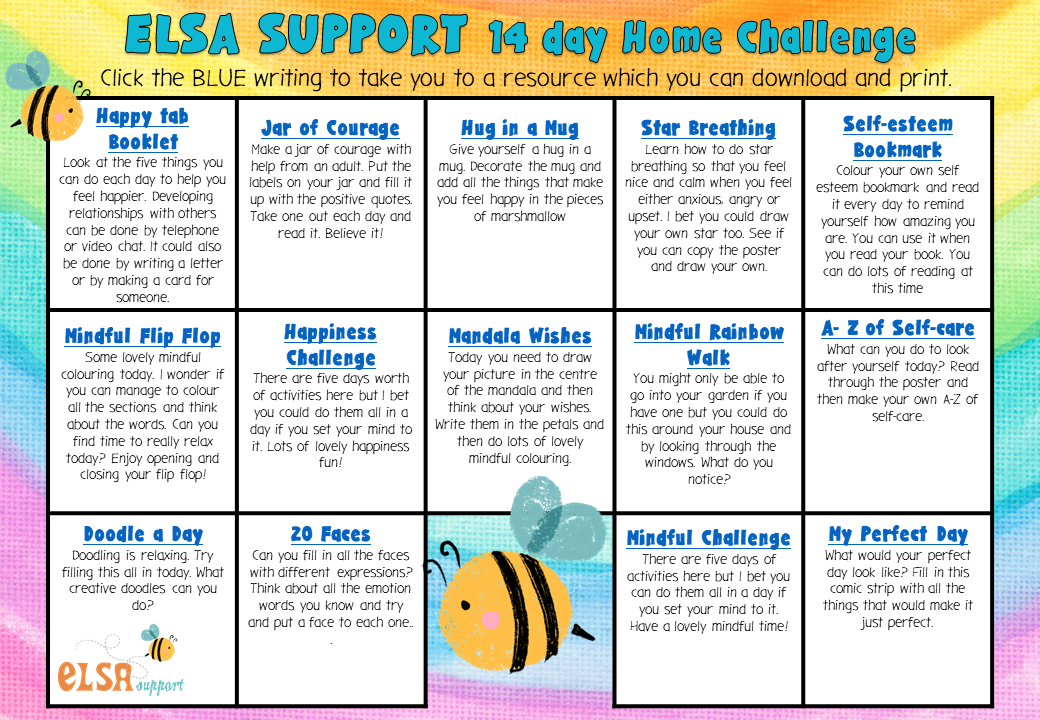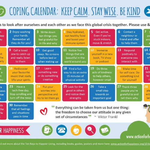 Make a list of ‘kind things’ that you want to do each day, for others or for yourself, then you can think about your kinds acts for each week; pick out one thing you want to celebrate, and one kind act someone did for you that made you feel happy